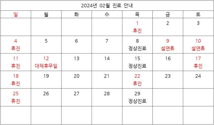 병원 진료 예약시 일정을 참고해주시기 바랍니다.