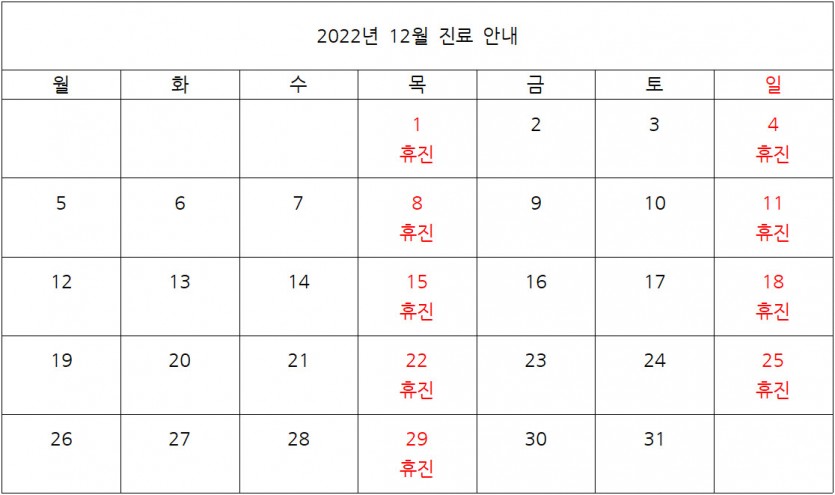 병원 진료 예약시 일정을 참고해주시기 바랍니다.