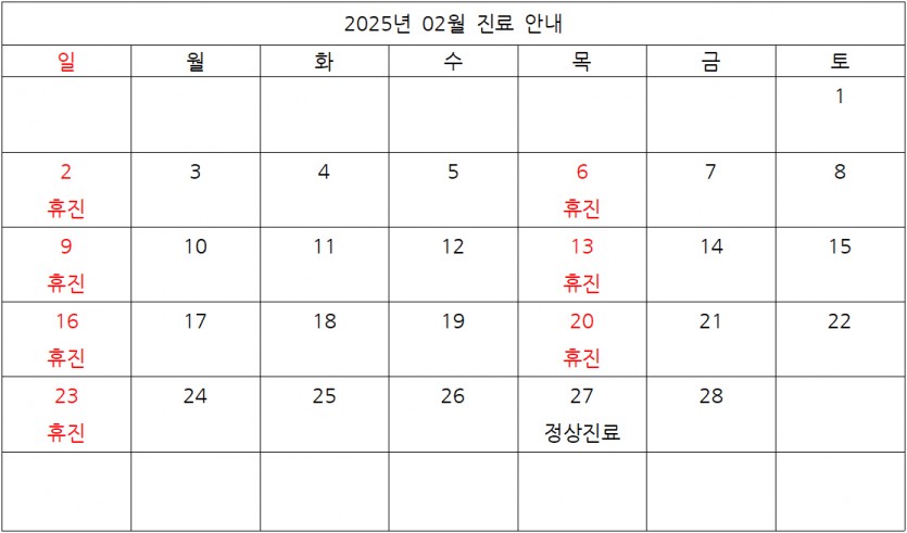 병원 진료 예약시 일정을 참고해주시기 바랍니다.