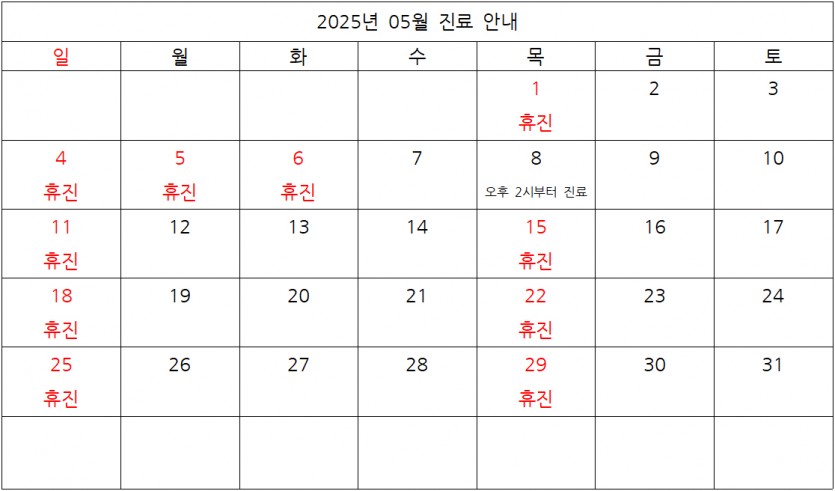 병원 진료 예약시 일정을 참고해주시기 바랍니다.