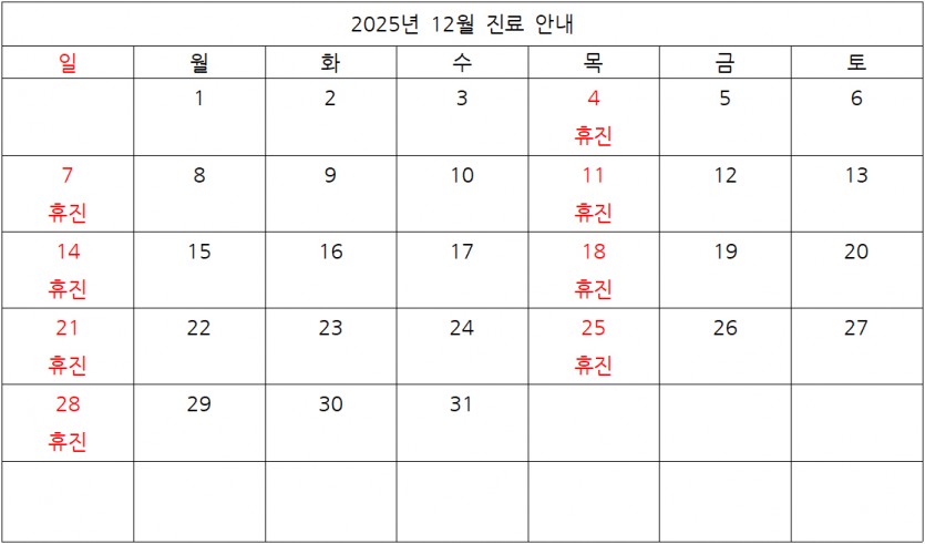 병원 진료 예약시 일정을 참고해주시기 바랍니다.